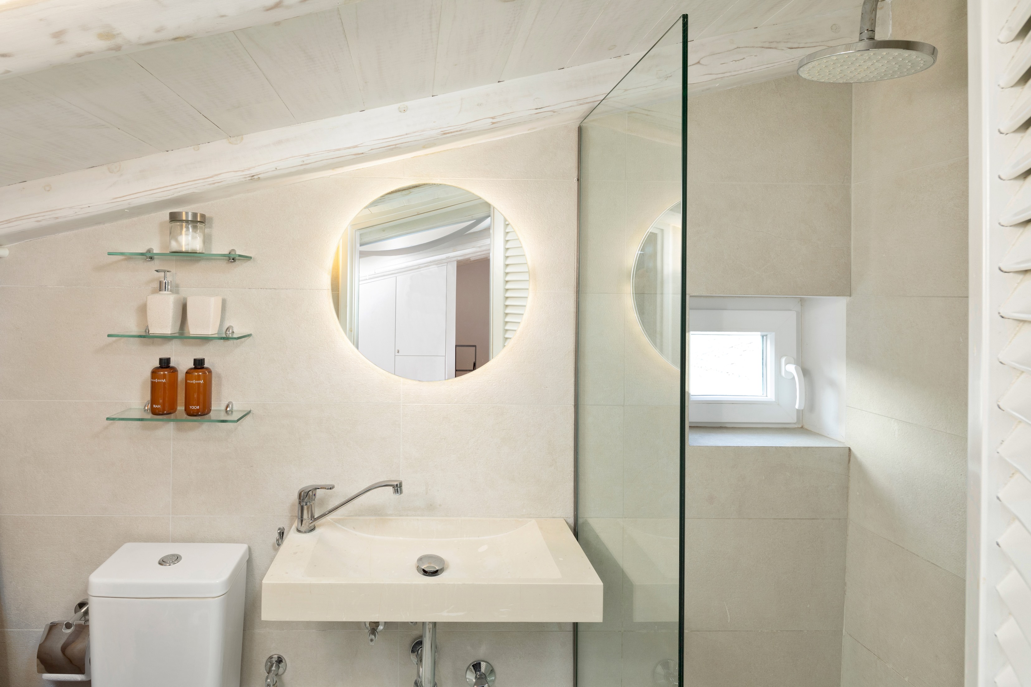 Upstairs, guests will find the sleeping quarters, featuring a snug double bed adorned with crisp linens and plush pillows. A private bathroom with a shower and washing machine offers added convenience, allowing guests to freshen up after a day of exploring the island's attractions.